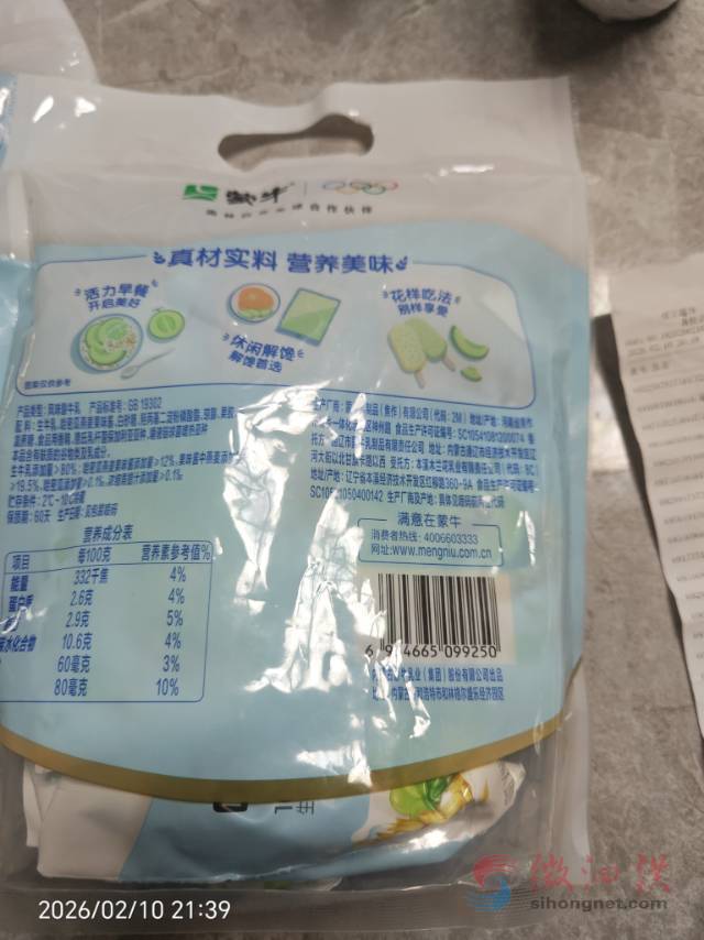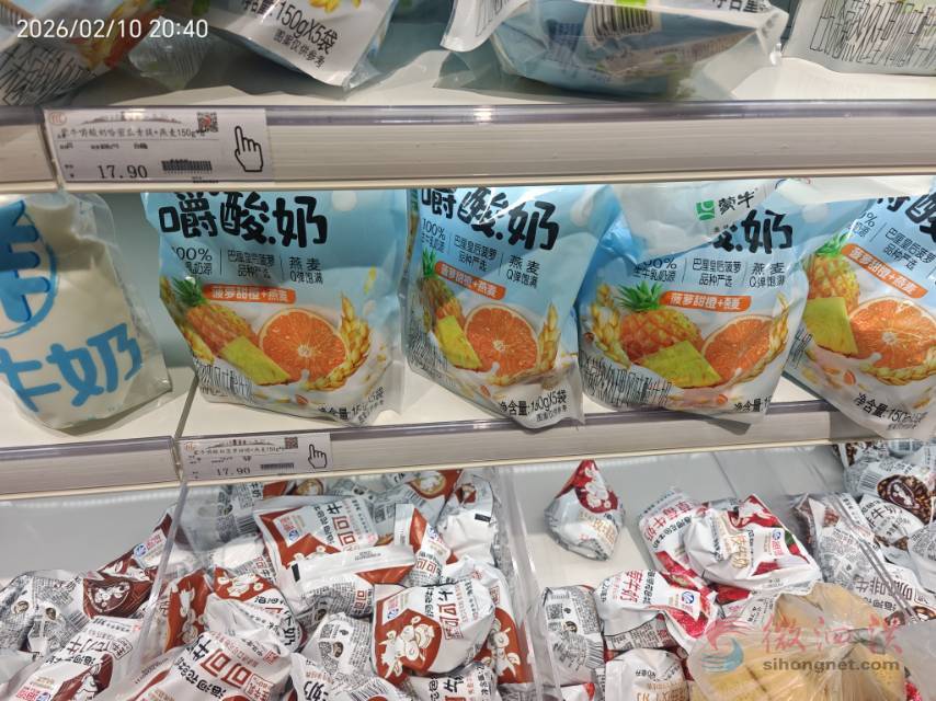 春节假期期间和家人在那个“红立”购物,在牛奶区啊,看到一款蒙牛的嚼酸奶,那么它的标签价格是17.9,然后是标签价是150g*8,在整个货架区啊,没有找到,只看到150g*5。那我就是拿了两包,一包是哈密瓜青提味的,一包是菠萝甜橙味的。